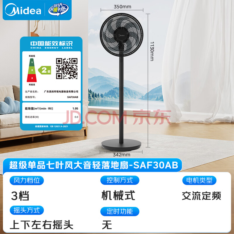 商品相册:美的(Midea)【超级单品】七叶轻音立式电风扇家用柔风落地扇台式桌面小型风扇大风量节能摇头宿舍电扇 SAF30AB第