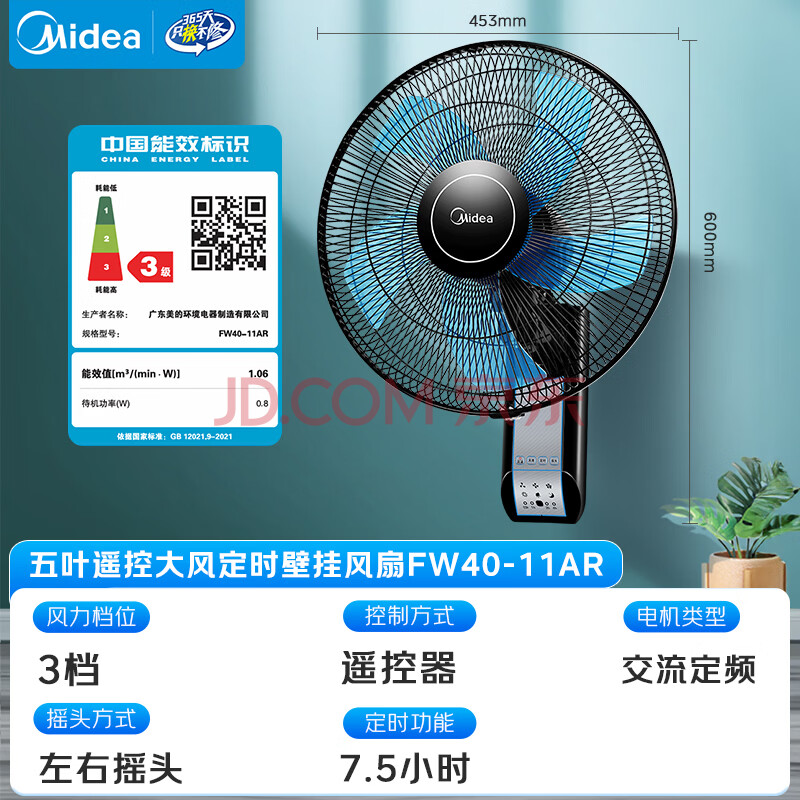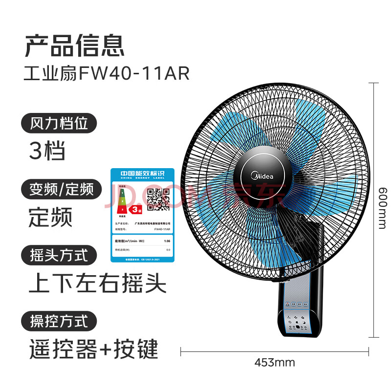 商品相册:美的(Midea)【五叶飓风】工业遥控壁扇/挂壁式商居两用风扇/120°广角摇头定时电风扇/工厂通风吊扇 FW40-11AR第