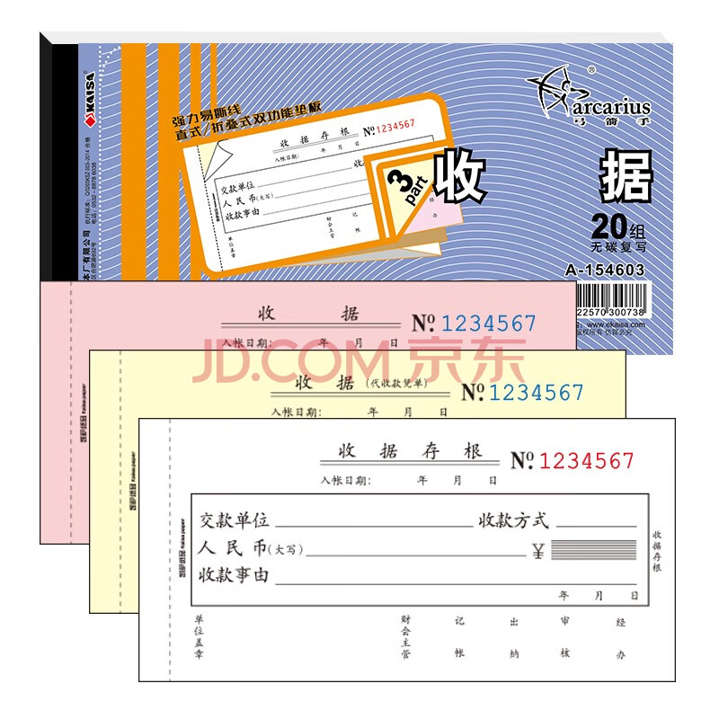 商品相册:凯萨(KAISA)54K/三联科目收据 3联20组无碳复写单栏收款收据手写打印单据票据 (173×85mm) 10本装 A-154603第