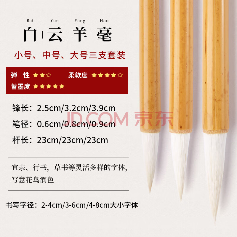 商品相册:六品书院毛笔羊毫大白云中楷小楷学生书法国画专用初学者入门毛笔三支装行书小白云毛笔第