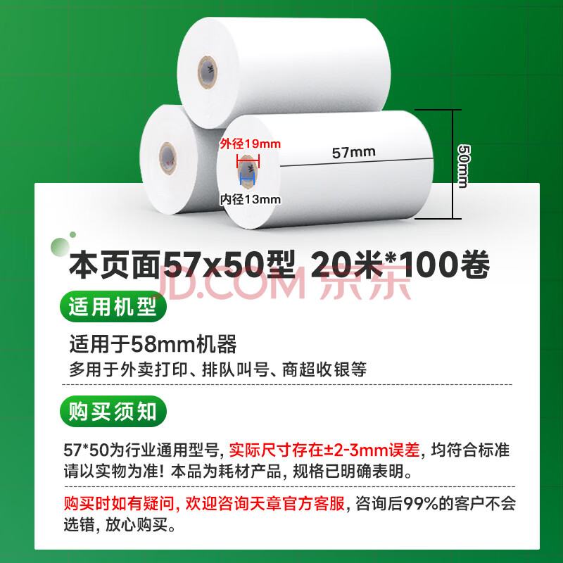 商品相册:天章 (TANGO)57*50mm20米*100卷 新绿天章 热敏收银纸京东美团外卖餐饮小票纸 超市收银打印适配58mm机器 P3610第