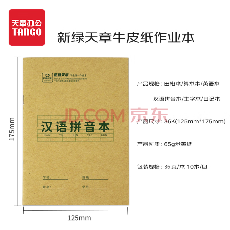 商品相册:天章(TANGO)36K汉语拼音本小学生统一标准大号9行7列作业本 学生练习簿笔记文具3-6年级学科 18张10本装第