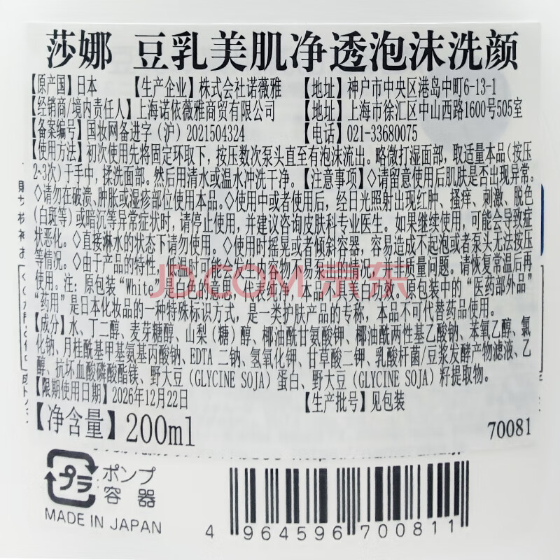 商品相册:莎娜(SANA)豆乳美肌净透泡沫氨基酸洗面维c按压泡泡洁面乳200ml第