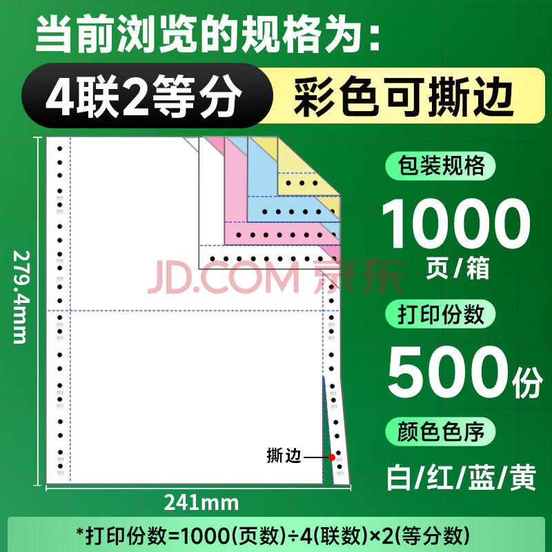 商品相册:天章 (TANGO)【缺页十倍赔】新绿天章四联二等分可撕边发票针式电脑打印纸1000页241-4-1/2S彩(白红蓝黄)可定制第