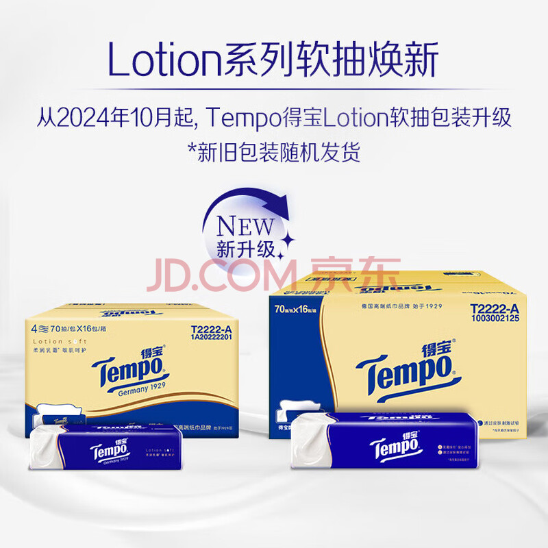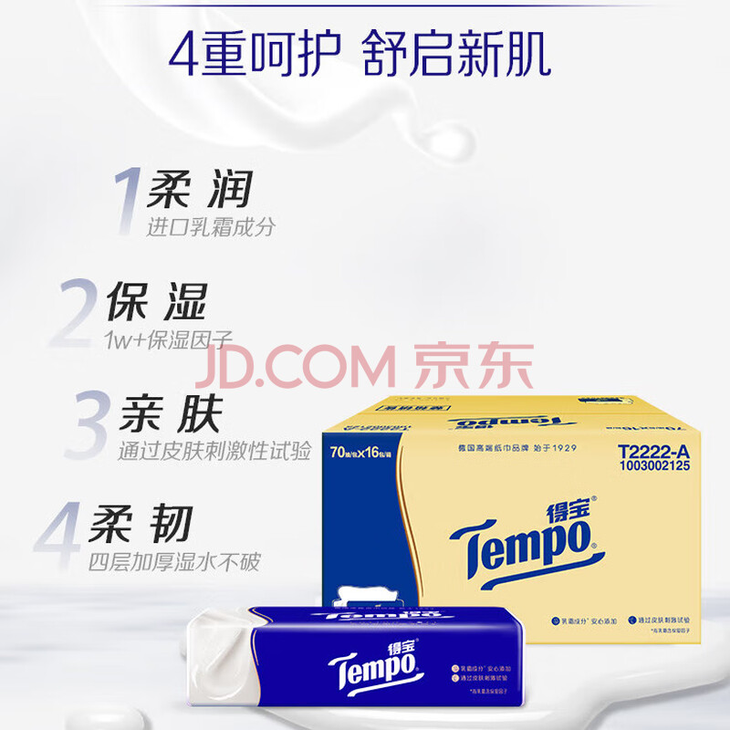 商品相册:得宝(TEMPO)一博同款 乳霜纸 Lotion4层70抽*16包 云柔巾 保湿婴儿纸巾 抽纸第