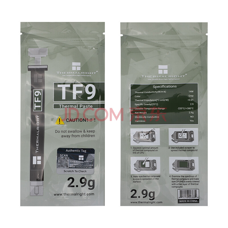商品相册:利民(thermalright)TF9(2.9g)(散热配件/CPU散热膏/2.9g装/导热系数14/笔记本导热膏/附带利民刮刀)第