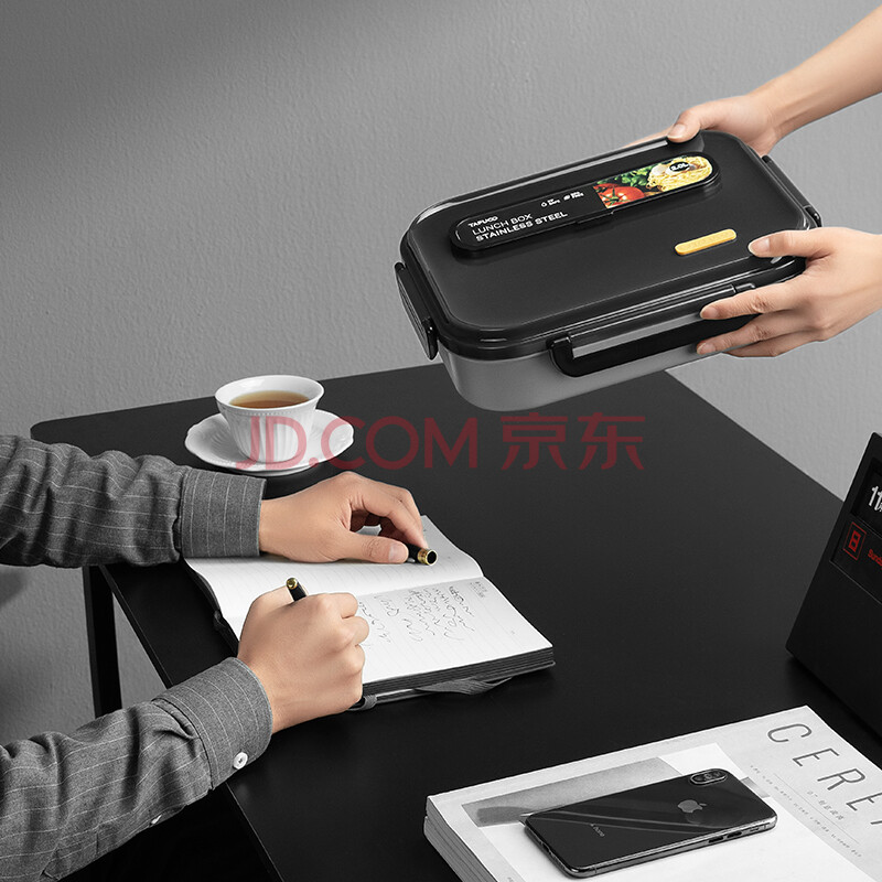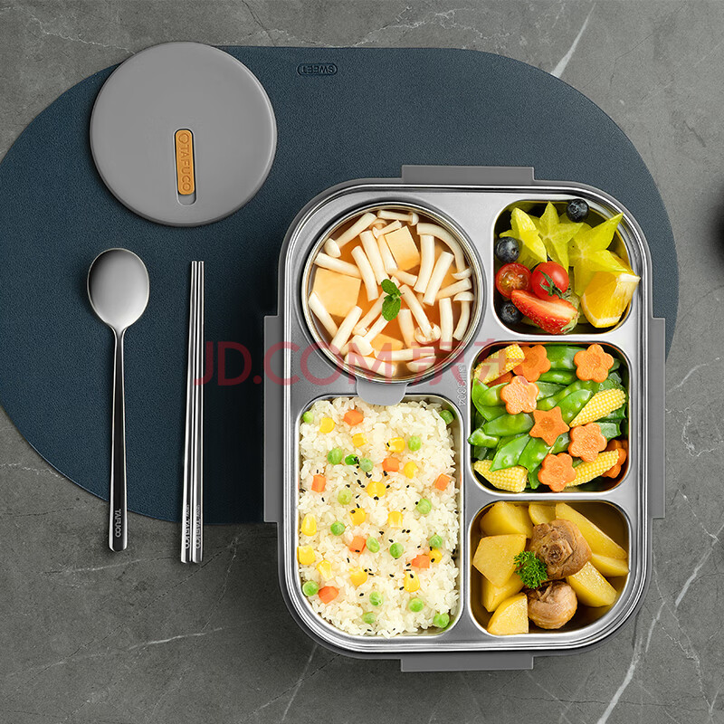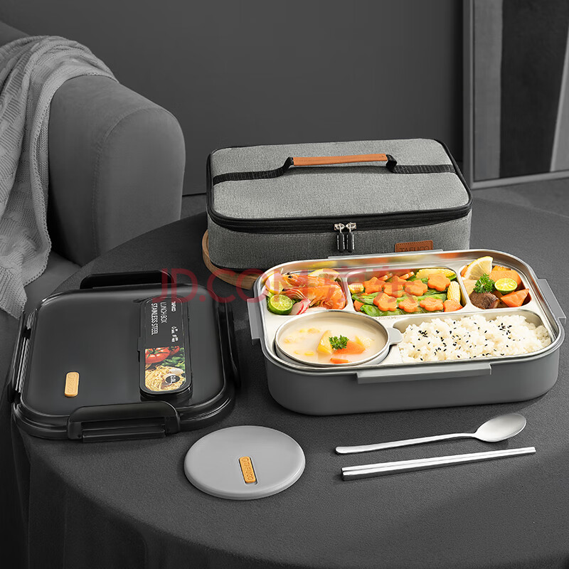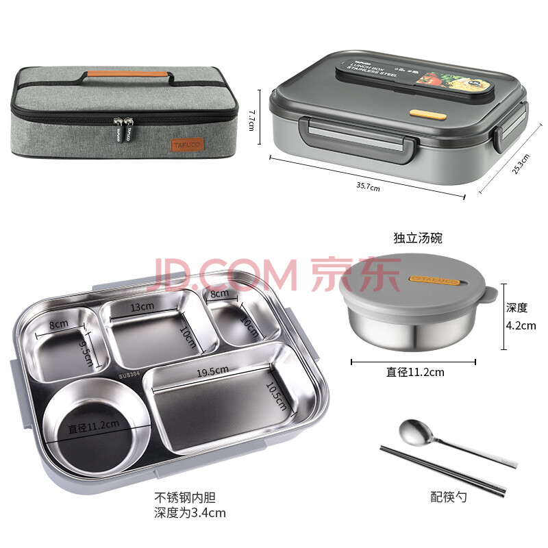 商品相册:泰福高(TAFUCO)饭盒304不锈钢五格餐盘防烫学生便当盒配餐具保温袋2.4LT5218棕色第