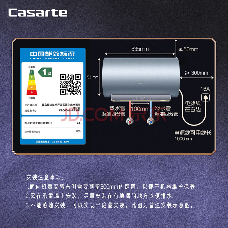 商品相册:卡萨帝(Casarte)80升家用储水式电热水器3KW瞬热10倍增容镁棒免更换一级能效CEC8005-AR3U1第