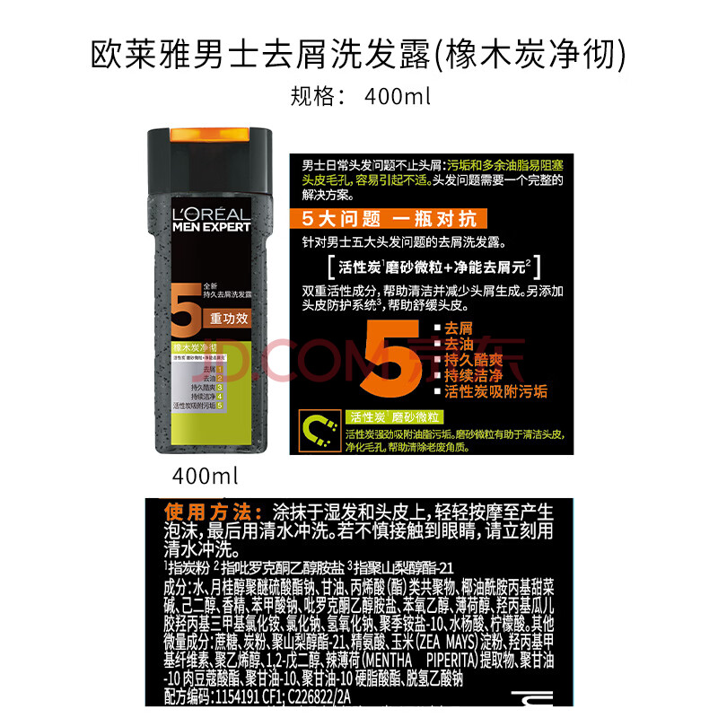商品相册:欧莱雅男士去屑洗发水(橡木炭净彻洗发露)400ml第