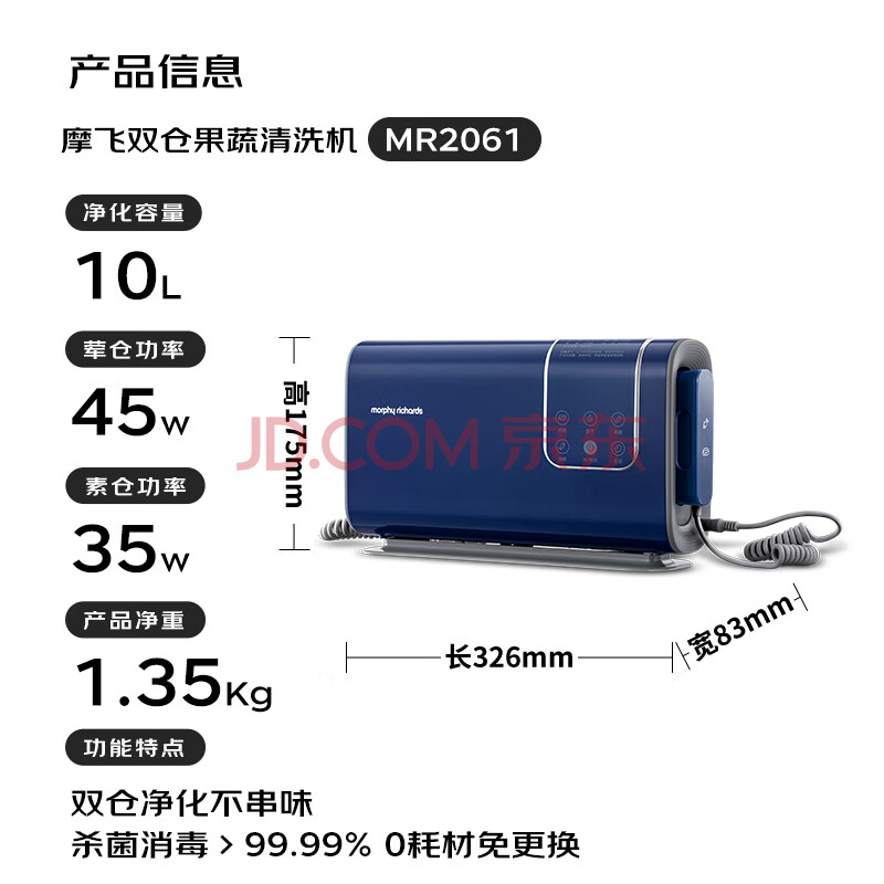 商品相册:摩飞电器(Morphyrichards)果蔬清洗机 家用双仓有线洗菜机 蔬菜水果分类去农残净化机洗水果神器 MR2061 轻奢蓝第