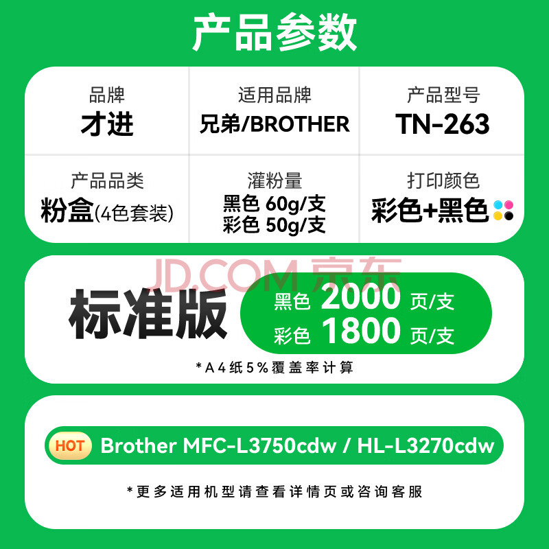 商品相册:才进适用兄弟TN263粉盒MFC-L3750cdw硒鼓HL-L3270cdw彩色打印机碳粉DCP-L3551cdw一体机L3770cdw墨盒TN267第