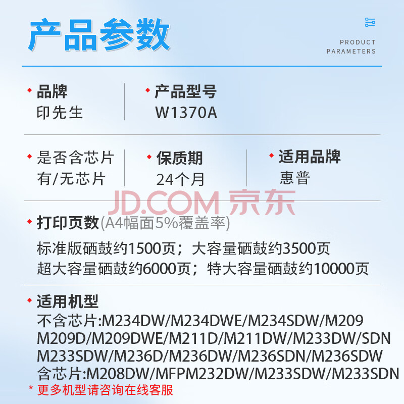 商品相册:印先生w1370X大容硒鼓含芯片 适用惠普137a硒鼓m232dw m208dw m232dwc m233sdn m233sdw m233dw m232dw墨粉盒第