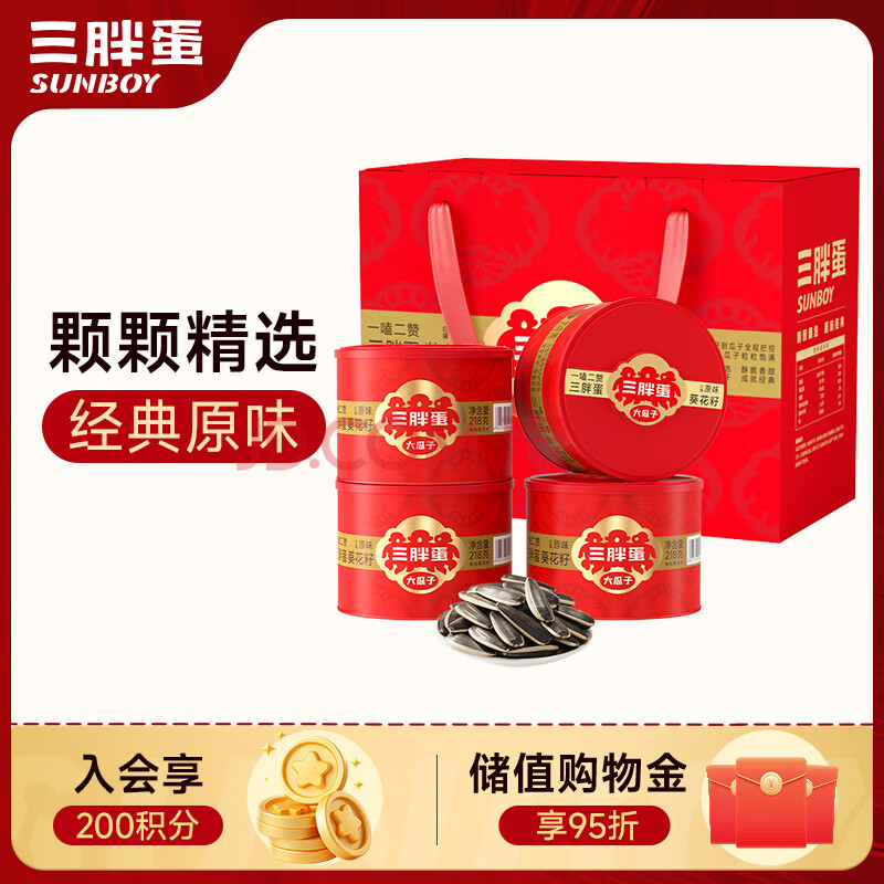 商品相册:三胖蛋原味大瓜子礼盒218g*4罐 坚果炒货大颗粒葵花籽休闲零食 佳节送礼第1张/共8