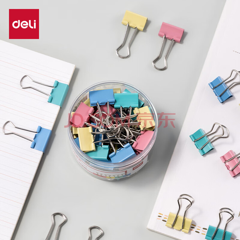 商品相册:得力(deli)【超级爆款】40只19mm彩色长尾夹票夹 5#小号金属燕尾夹票据文件夹办公 40只/筒 8555ES第