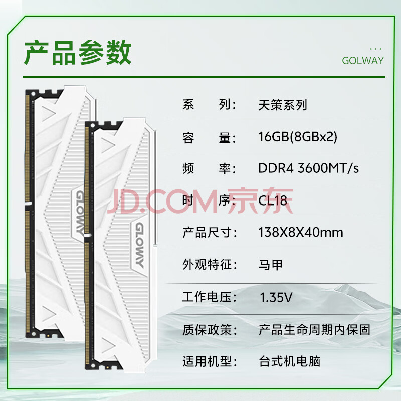 商品相册:光威(Gloway)16GB(8GBx2) DDR4 3600 台式机内存条 天策 马甲条 精选颗粒 CL18 皓月白第