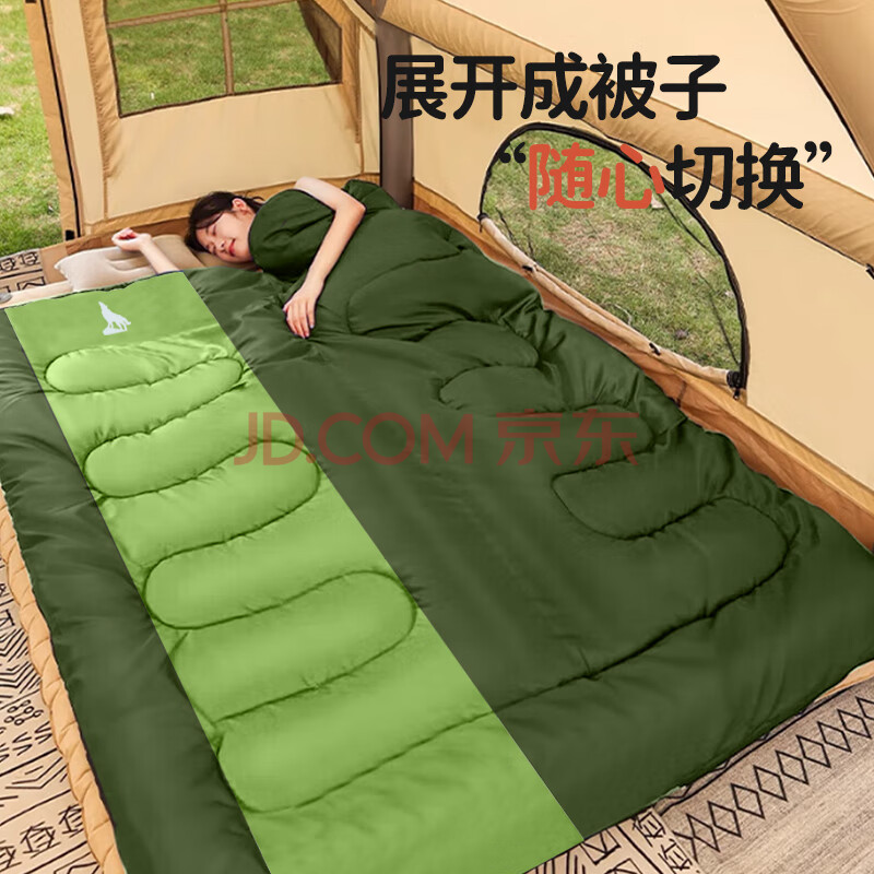 商品相册:北极狼(BeiJiLang)成人户外旅行冬季四季保暖露营双人隔脏中空棉睡袋 1.35KG 军绿第