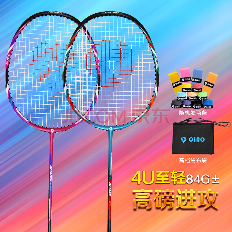 商品相册:启傲(QIAO)羽毛球拍对拍比赛套装AT5碳素中杆羽拍4U22磅绒布袋含手胶紫烙蓝第