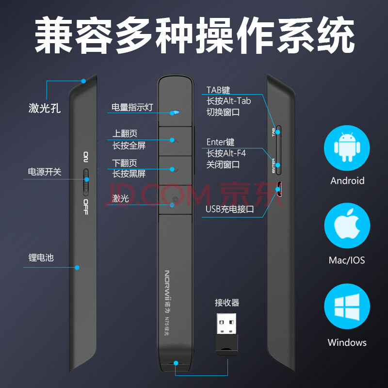 商品相册:诺为翻页笔可充电 PPT激光笔教师用投影 多媒体无线演示器 教学课件演讲会议电子教鞭笔 N75红光黑色第1张/共7