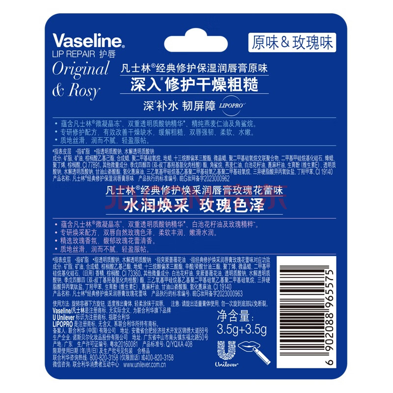 商品相册:凡士林[断货王]润唇膏套装3.5gx2淡化唇纹滋润原味+玫瑰味有效期26年9月第