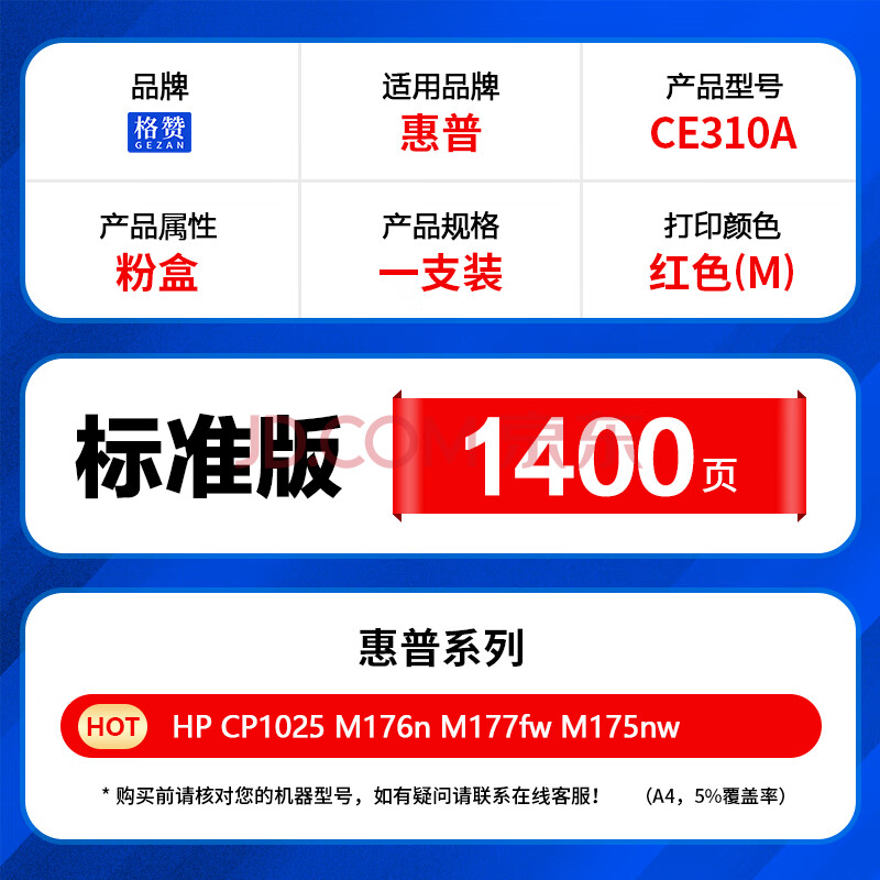 商品相册:格赞CE310A粉盒红色适用惠普CP1025硒鼓M176n M177fw碳粉M175nw佳能LBP7010C LBP7018C CF350A打印机CRG329墨盒第