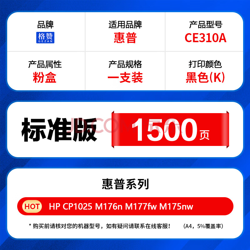 商品相册:格赞CE310A粉盒黑色适用惠普CP1025硒鼓M176n M177fw碳粉M175nw佳能LBP7010C LBP7018C CF350A打印机CRG329墨盒第