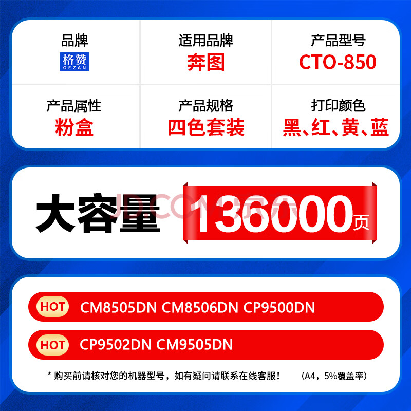 商品相册:格赞CTO-850X粉盒适用奔图CM8505DN CM8506DN墨粉CP9500DN CP9502DN墨盒CM9505DN碳粉硒鼓四色套装大容量第