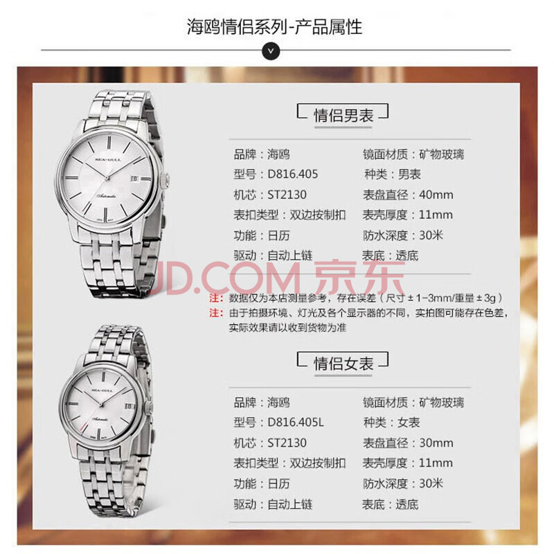 商品相册:海鸥(SEAGULL)情侣手表男女自动机械表 日历腕表 情侣表一对 816.405对表礼物第