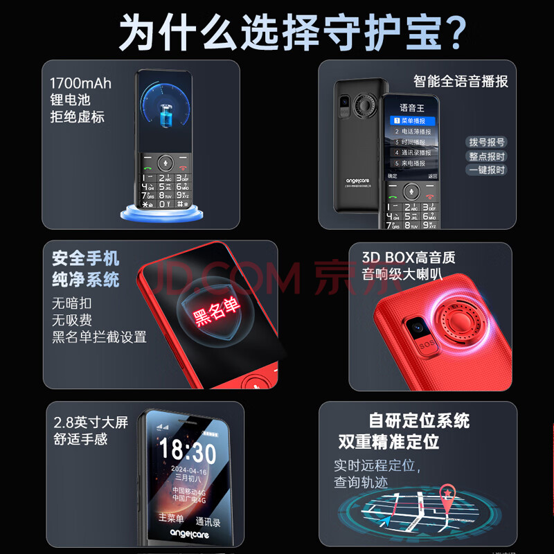 商品相册:守护宝 K199 全网通4G老人机超长待机 2.8英寸智能老人老年手机 大字大声直板按键学生手机 黑色第