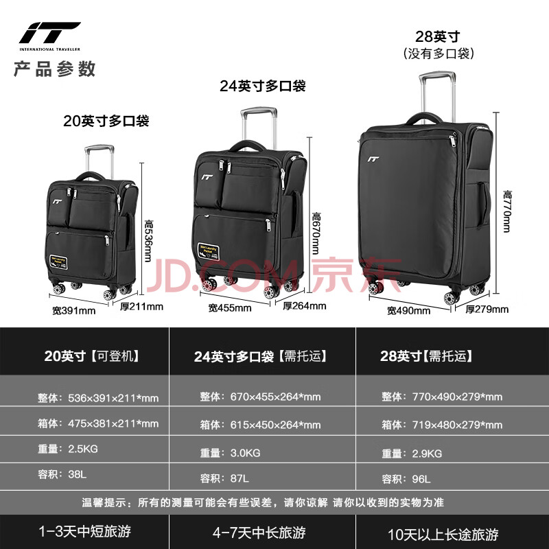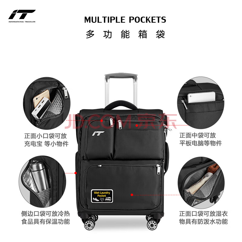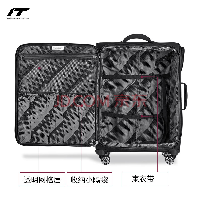 商品相册:INTERNATIONAL TRAVELLER英国IT拉杆箱旅行箱万向轮超轻行李箱20英寸登机软布箱1157黑色第