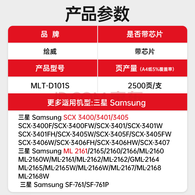 商品相册:绘威MLT-D101S硒鼓 适用三星SCX-3401 3400 3405 3406粉盒ML-2161 2162 2164 2165打印机硒鼓 易加粉 中文版第