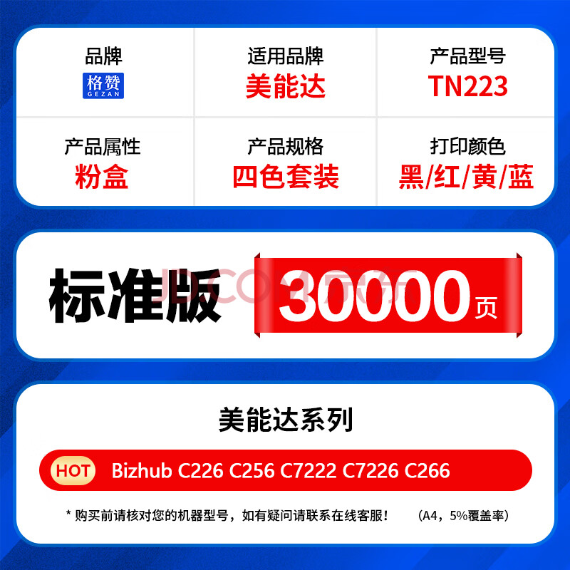 商品相册:格赞适用柯尼卡美能达C226粉盒TN223墨盒Bizhub c256碳粉C7222墨粉C7226 C266打印机震旦ADC225/265四色套装第
