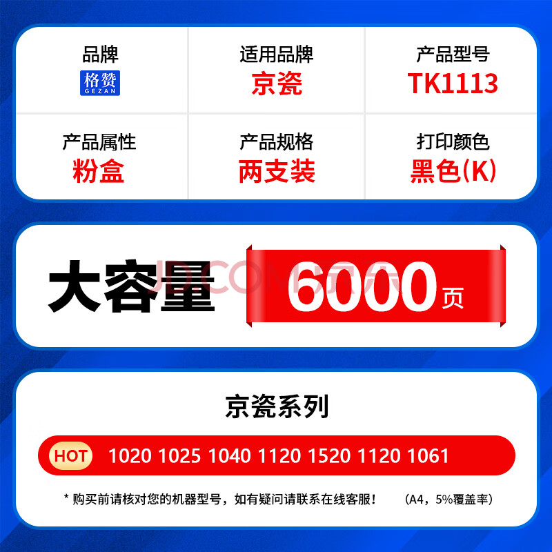 商品相册:格赞TK1113粉盒适用京瓷1020粉盒fs-1020mfp 1025墨粉盒1040墨盒1120 M1520H 1125 1061DN打印机硒鼓大容量2支装第