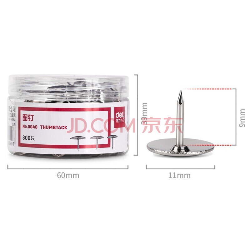 商品相册:得力0040图钉(300枚/筒)5筒按钉镀镍大头钉子摁钉圆头小图钉软木板装饰钉第