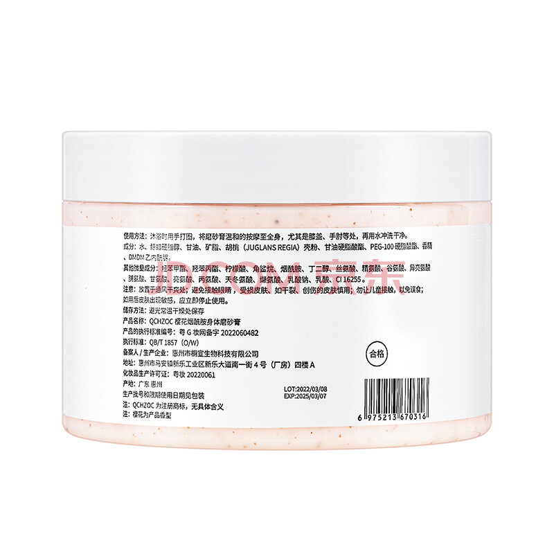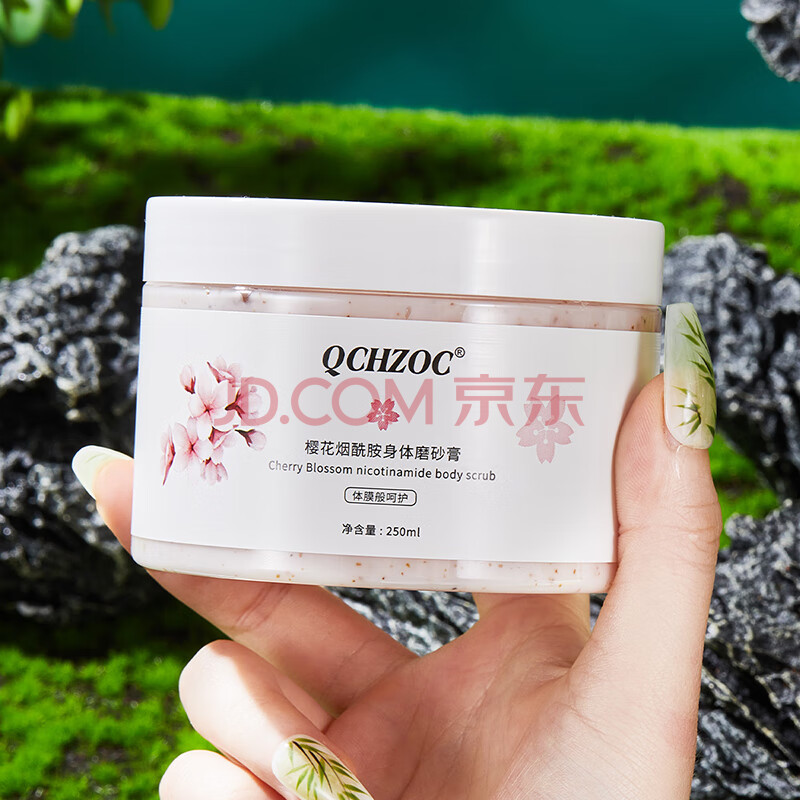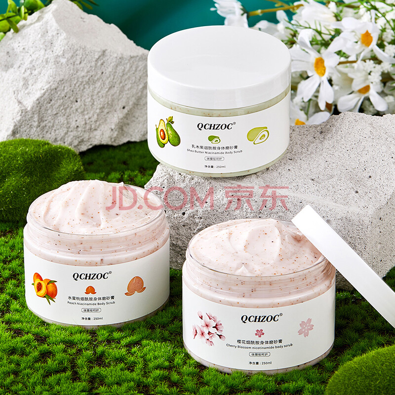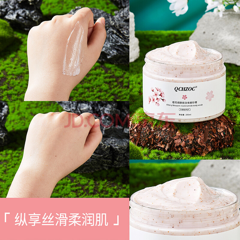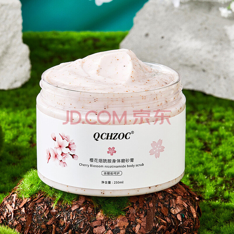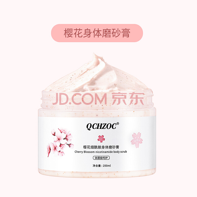 商品相册:QCHZOC樱花植萃烟酰胺净肤深层清洁焕亮肌肤保湿滋润男女冰淇淋身体磨砂膏 250g/瓶 第1张/共9