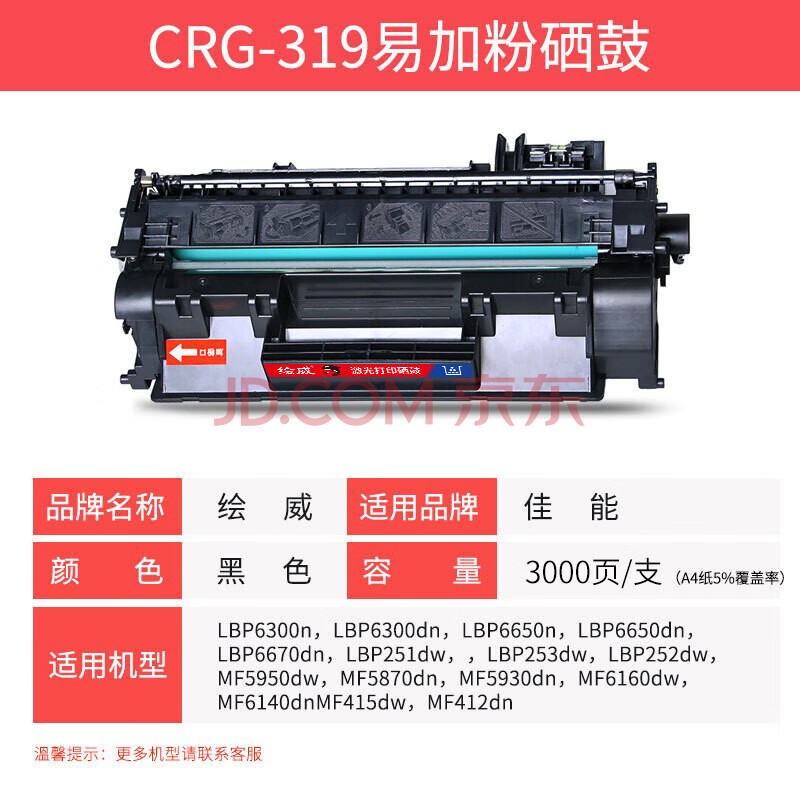 商品相册:绘威CRG-319易加粉硒鼓 适用佳能6300 6300n 6300dn 6650n 6650dn MF5850dn 5870dn 5880dn惠普CE505A 505A第