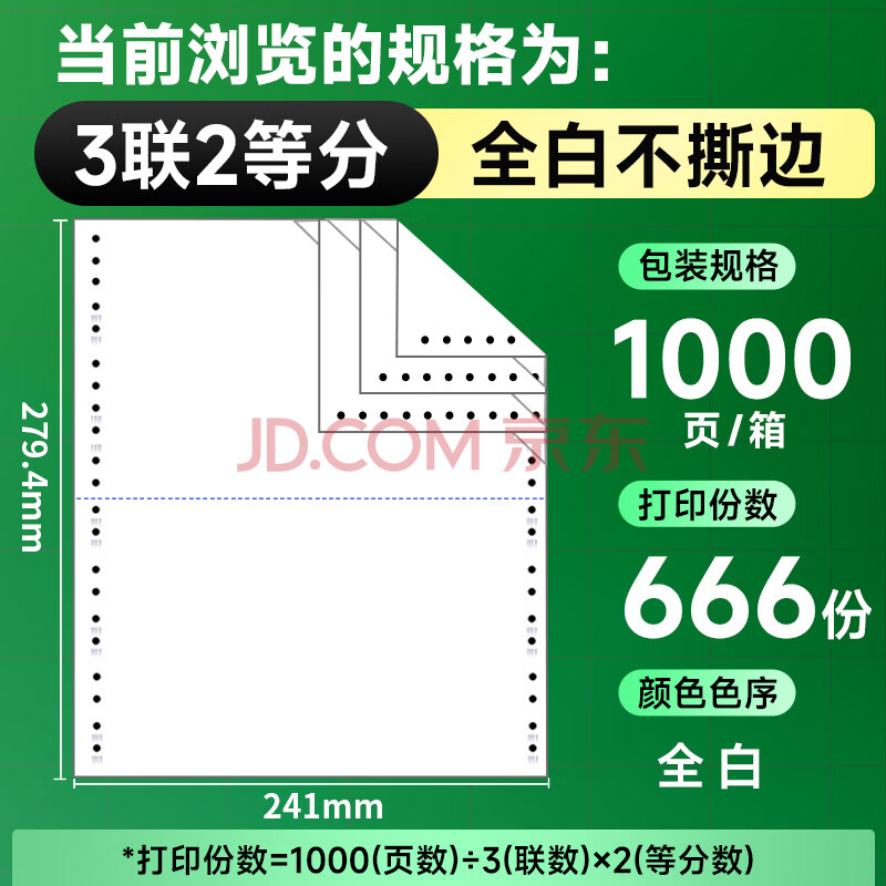 商品相册:天章 (TANGO)【缺页十倍赔】新绿天章三联二等分不撕边 针式电脑打印纸 出入库送货单 (241-3-1/2 全白 1000页)第