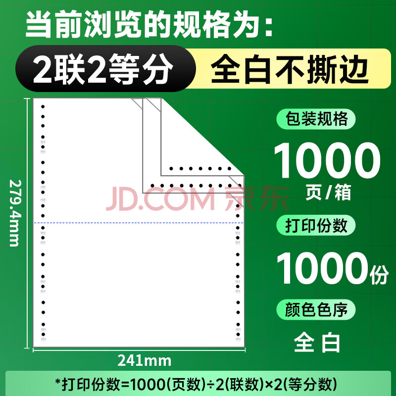 商品相册:天章 (TANGO)【缺页十倍赔】新绿天章二联二等分不撕边 针式电脑打印纸 出入库送货单 (241-2-1/2 全白 1000页)第