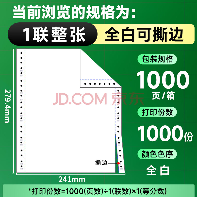 商品相册:天章 (TANGO)【缺页十倍赔】新绿天章一联整张可撕边 针式电脑打印纸 出入库送货单发票票据(241-1S全白1000页)第
