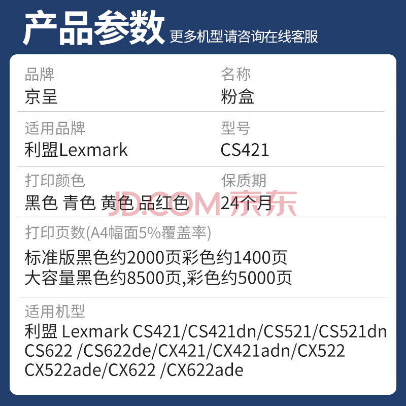 商品相册:京呈适用利盟CS421粉盒CX421 CS321 CX420 CX520 CX521彩色打印机墨粉盒 CS421黑色粉盒 约8500页第