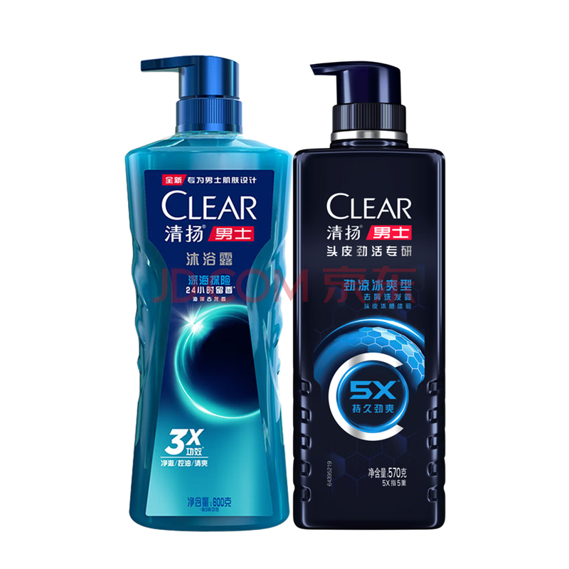 商品相册:清扬男士劲凉冰爽去屑洗发水570g+沐浴露600g 京东直送洗发沐浴套装第