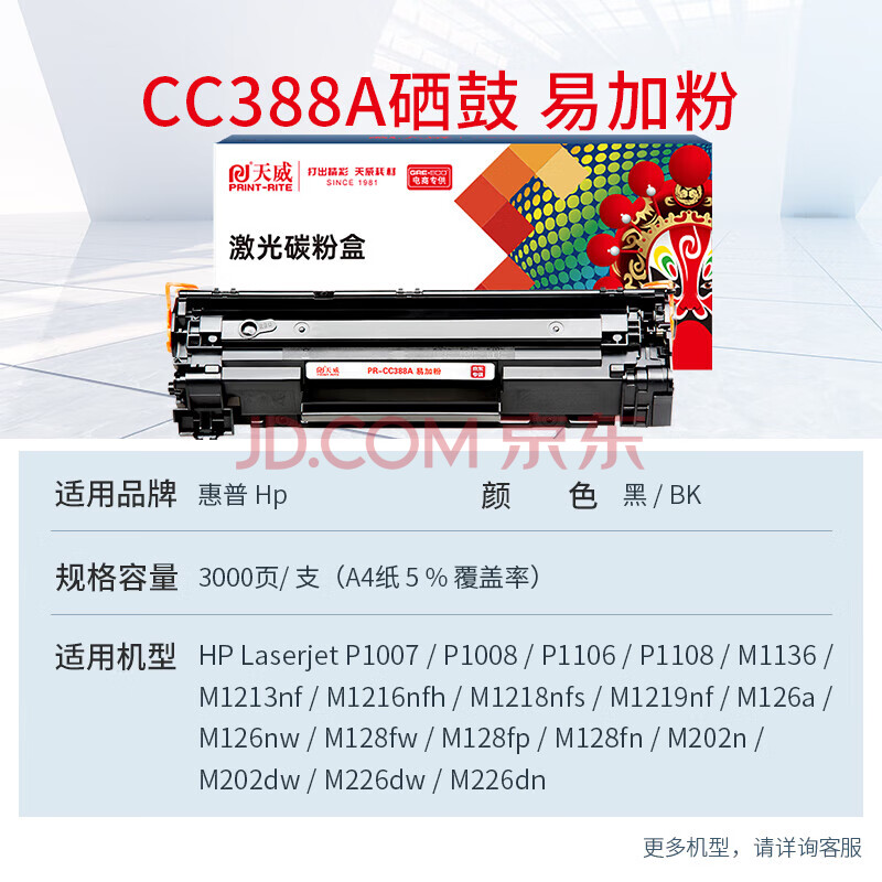 商品相册:天威CC388A/88X硒鼓易加粉 4支装适用惠普HP P1108 M126a P1106 M1136 P1008 M1213nf m128fp/fn打印机墨盒第