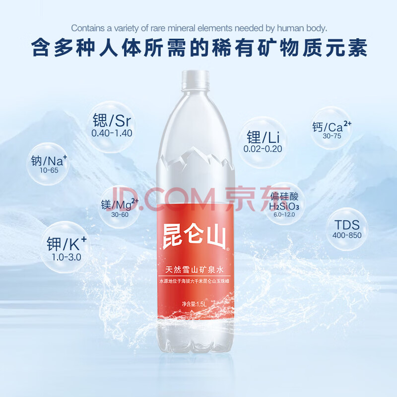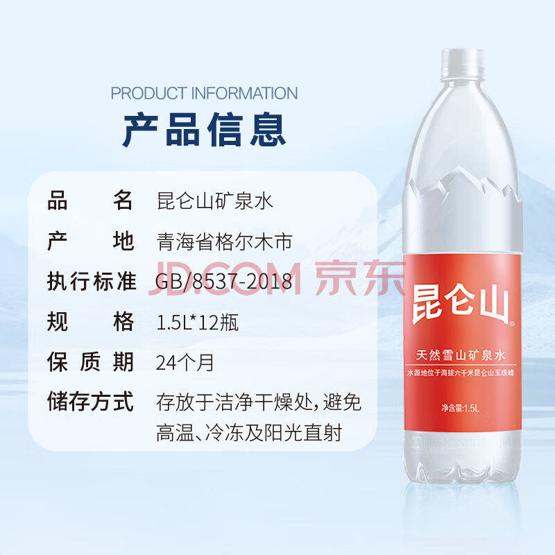 商品相册:昆仑山矿泉水 饮用天然弱碱性 1.5L*12瓶 高端整箱装 加多宝出品第