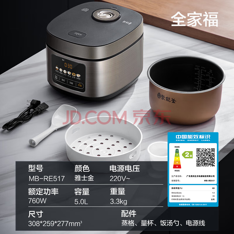 商品相册:美的(Midea)电饭煲电饭锅4-5人家用5升大容量 炫彩大屏金属机身大火力煮饭锅智能预约微压MB-RE517第