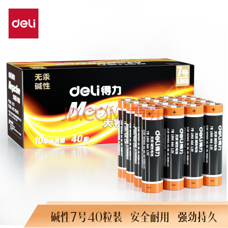商品相册:得力(deli)7号电池 碱性干电池40粒装 适用耳温枪/血糖仪/无线鼠标/遥控器/血压计/挂钟/电子锁等 18513第