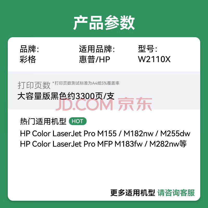 商品相册:彩格W2110X黑色大容量硒鼓 适用惠普HP M255DW M255NW M282NW M283FDN M283FDW彩色打印机墨粉盒需安装旧芯片第
