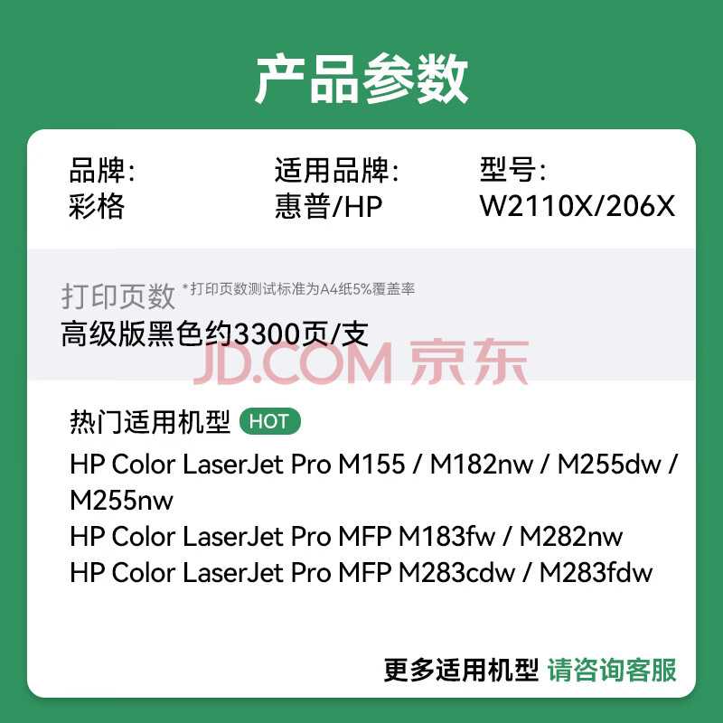 商品相册:彩格适用HP惠普M283fdw硒鼓206A M282nw粉盒m182nw m255dw墨盒m283cdw打印机硒鼓m183fw带芯片W2110A彩色墨粉仓第