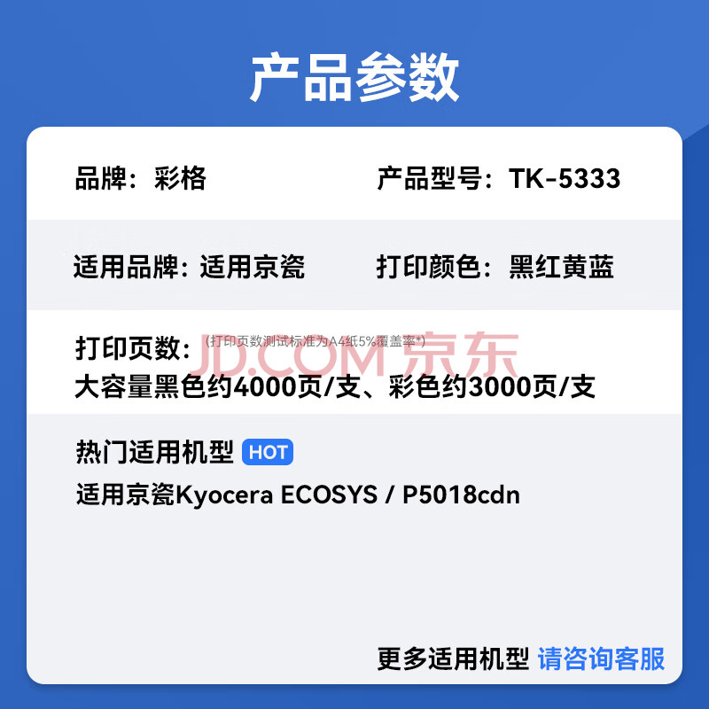 商品相册:彩格TK-5333四色粉盒套装 适用京瓷Kyocera ECOSYS P5018cdn打印机硒鼓墨粉盒 复印机碳粉盒墨盒第