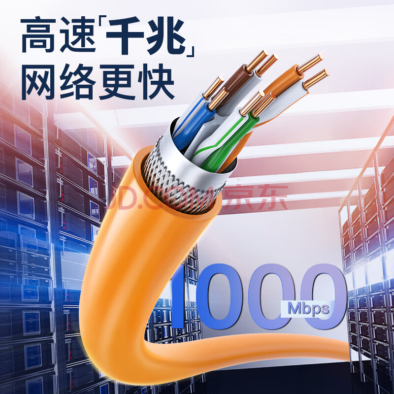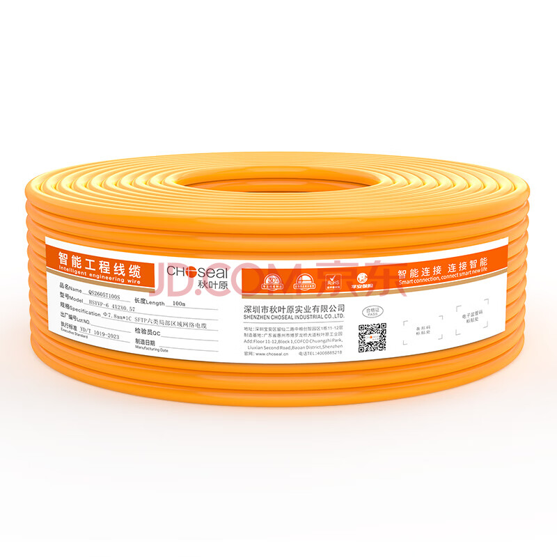 商品相册:秋叶原(CHOSEAL)六类网线 双屏蔽 抗干扰降衰减千兆纯铜 POE供电工程家装安全传输网线 橙 100米 QS2605T100S第