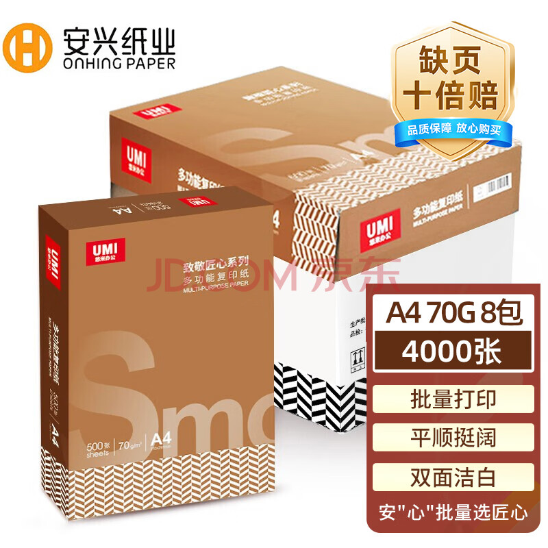 商品相册:安兴 匠心A4打印纸70克双面复印纸热销流畅多功能办公室白纸批量草稿纸整箱500张/包8包/箱4000张第