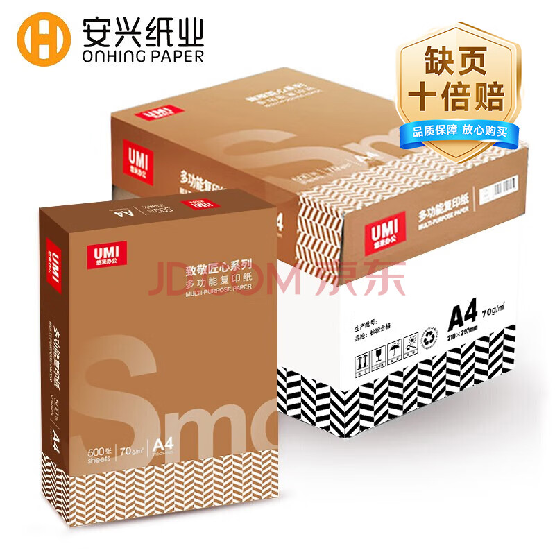 商品相册:安兴匠心a4打印纸复印纸多功能A4纸双面草稿纸办公热销70g500张/包 5包/箱(2500张)京东自营第